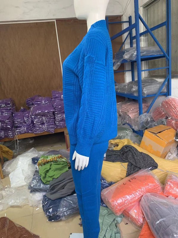 Women's Fashion V-neck Solid Color Suit Sweater + Knitted Pants